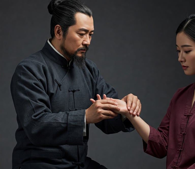 Pulso que é avaliado em três posições e três níveis de profundidade em cada punho, correspondendo a órgãos internos; palpação abdominal; palpação de meridianos e pontos de acupuntura.
